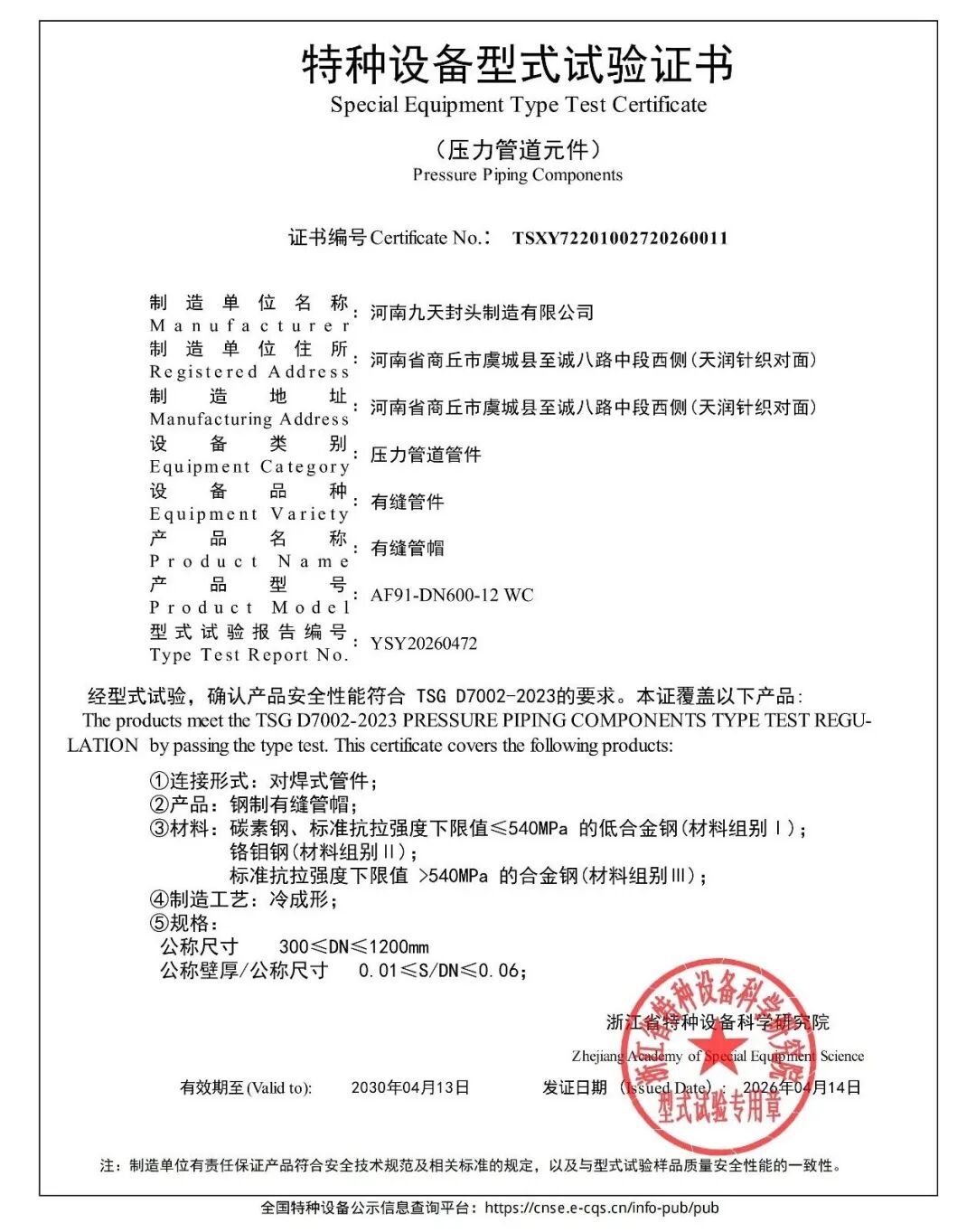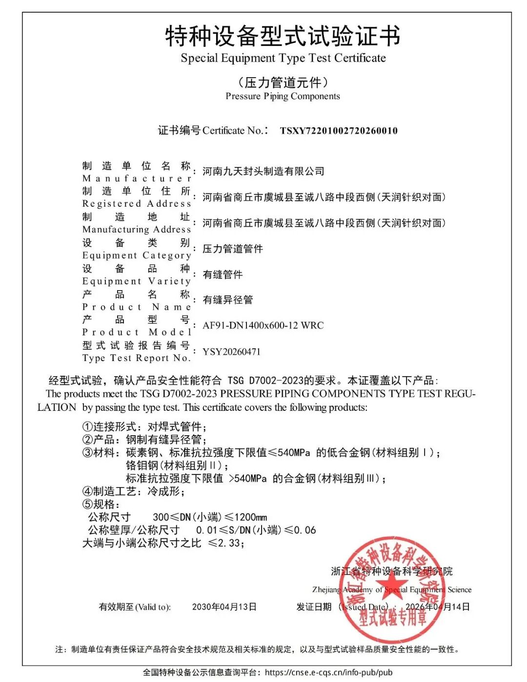 近日,河南九天封头制造有限公司传来捷报,成功斩获两项特种设备型式试验证书,标志着公司在压力管道元件领域的产品安全与制造实力获得国家权威认可,为企业高质量发展再添强劲动力!